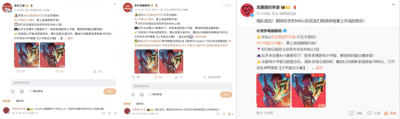 在社交平台,除京东自有账号矩阵发声外,还联动联想、红米、红魔等品牌官微共同发力,形成“趋势品类联盟”放大声量,锁定游戏人群定向传播。