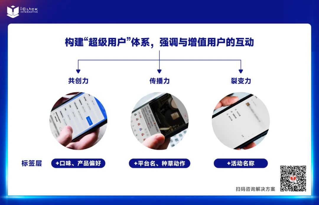 先从“找到流量”开始,通过洞悉产品目标受众的社交兴趣与偏好,精准地定位目标群体。接着从“制造流量”切入,通过为目标群体打标签,并投放符合其喜好的内容和活动,在实现精准触达的基础上,撬动新流量的涌入。最后到“维护流量”闭环,通过提供定制化的内容、游戏、活动等各类互动设计,实现精细化运营,缩短品牌与消费者的距离,建立情感连接,实现转化或复购。爱点击的私域场景解决方案全面覆盖了私域运营的各个阶段,从锁定流量源头,到吸引新流量进入,再到持续精细化的用户关系运营,为品牌方的私域构筑一条完整的闭环成长路径。