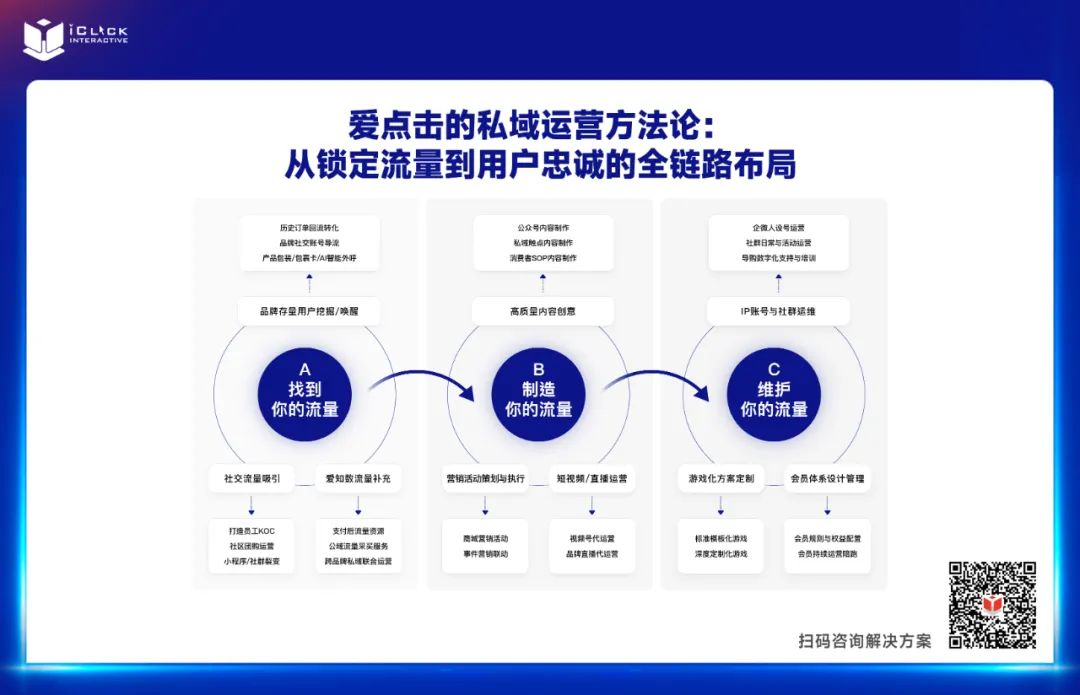 有效的私域运营不但需要专业的方法和策略,还需要经验丰富的精细化运营,以及促成转化的逻辑闭环。爱点击私域场景解决方案,专为品牌提供私域增长的全套工具及代运营服务,在私域数字化运营与管理方面拥有一套完整的方法论体系。
