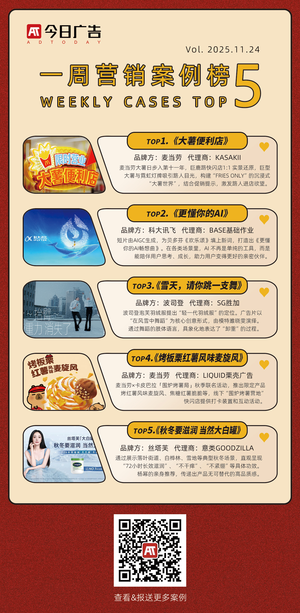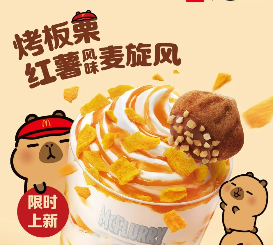 麦当劳× 卡皮巴拉「围炉烤薯局」秋季联名活动。结合秋季“烤红薯”的温暖场景与卡皮巴拉的“松弛感”,推出限定产品烤红薯风味麦旋风、焦糖红薯脆脆等,传递“暖、甜、酥、脆”的治愈体验。将秋季街头烤红薯的怀旧场景与消费者对“松弛感”的需求结合,强调“慢慢烤,大口旋”的治愈体验。包装采用暖色调和手感触感材质,还原“刚出炉”的温暖感;线下设置“围炉烤薯营地”快闪店,提供打卡装置和互动活动。